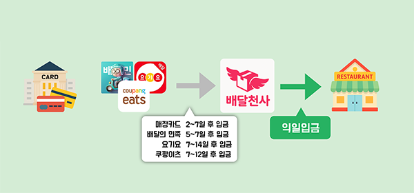 배달 플렛폼 (배달의 민족, 요기요, 쿠팡이츠), 매장 카드 매출까지 익일 전액 입금